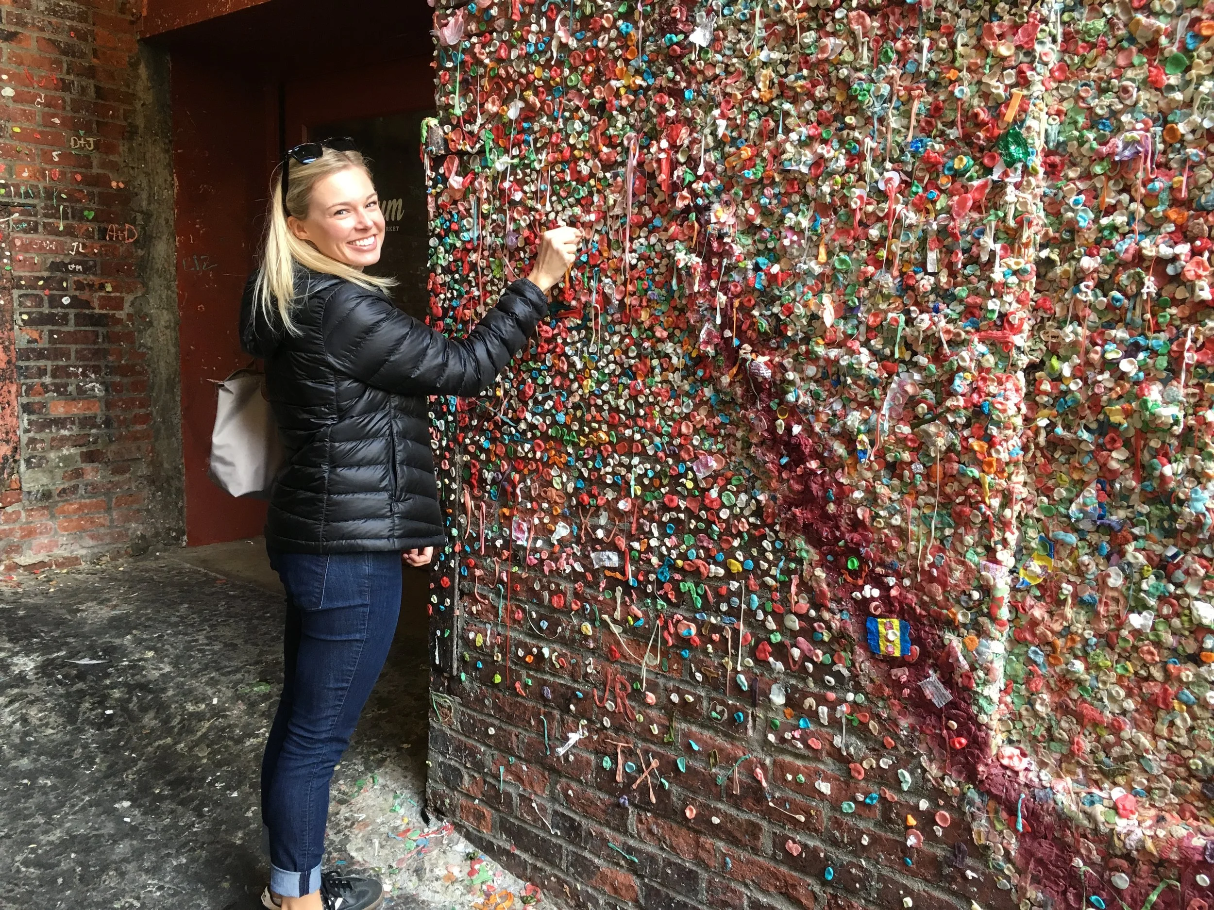We had another day to explore while our tour guides worked, and we had a packed agenda. Tommy chose to start his day to go on another run. I chose to wait for him to bring me back some coffee and a scone...it's all about balance. By the time we were out the door we were ready for lunch, and a Beecher's grilled cheese was calling our names. The line was long, the sandwich was worth it, and afterwards we made a swing by the gum wall to make our contribution.